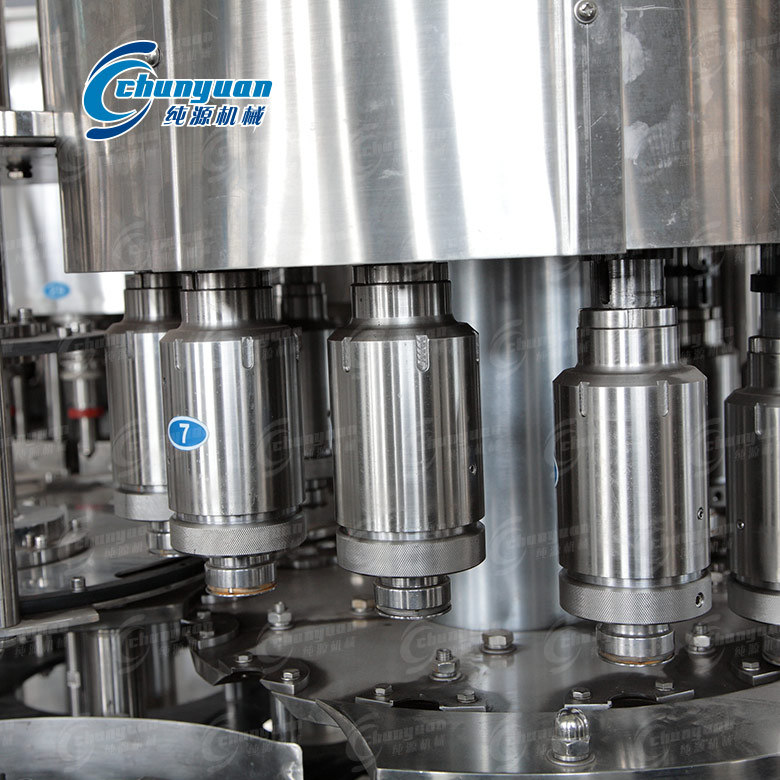 全自動飲用水灌裝機械采用卡瓶頸傳動技術,實現全自動沖瓶、灌裝、旋蓋等工序,自動化程度高。