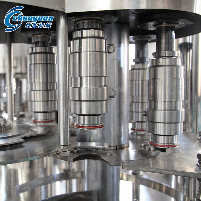 進入水灌裝設備的瓶子由瓶頸托板卡住并在凸輪作用下將瓶子上升,然后由瓶口將灌裝閥頂開。灌裝采用重力灌裝方式。灌裝閥打開后物料通過灌裝閥完成灌裝過程,灌裝結束后瓶口下降離開灌裝閥,瓶子通過卡瓶頸過渡撥輪進入旋蓋機。旋蓋機上的止旋刀卡住瓶頸部位,保持瓶子直立并防止旋轉。旋蓋頭在旋蓋機上保持公轉并自轉,在凸輪作用下實現抓蓋、套蓋、旋蓋、脫蓋動作,完成整個封蓋過程。成品瓶通過出瓶撥輪從旋蓋機傳送到出瓶輸送鏈上,由輸送鏈傳送出三合一水灌裝機