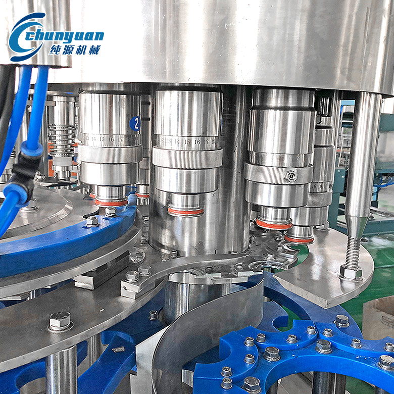 小瓶裝三合一純凈水設(shè)備。進入灌裝機的瓶子由瓶頸托板卡住并在凸輪作用下將瓶子上升,然后由瓶口將灌裝閥頂開。灌裝采用重力灌裝方式。灌裝閥打開后物料通過灌裝閥完成灌裝過程,灌裝結(jié)束后瓶口下降離開灌裝閥,瓶子通過卡瓶頸過渡撥輪進入旋蓋機。