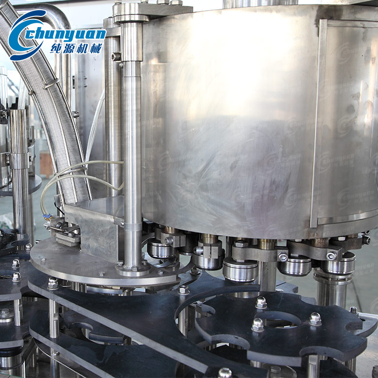 易拉罐椰子汁飲料機械采用常壓灌裝原理,當空罐經撥輪進入升降托罐盤后,灌裝閥和空罐對中,空罐升起并密封,同時自動打開灌裝閥的閥口,當灌裝液面堵住閥的回氣管口時停止灌裝。灌好的罐子經鉤子鏈送到封口機頭,蓋子經送蓋器及壓頭把蓋子送到罐口上,當托罐機構升起時,壓頭壓緊罐口,封口輪先預封再實封,罐子封好后被打蓋機構的打頭推出,然后進入出罐輸送。